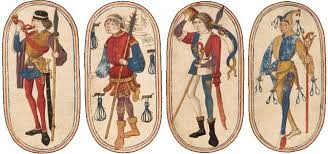 The four suits are comprised of dog collars, tethers for the hounds, nooses for birds, and hunting horns. The oval cards number 52 plus one blank.